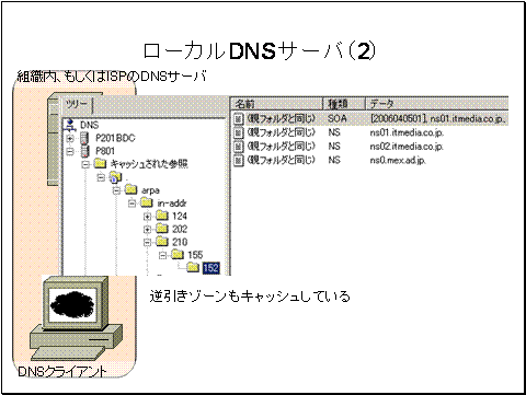 DNSサーバは管理しているネットーク上のクライアントホストから、インターネット上など自身が管理していないネットワーク上のホストを対象とする名前解決のリクエストの名前解決に成功すると、一定時間キャッシュとして成功エントリを保持します。この解決キャッシュはあたかもファイルのディレクトリと同様にツリーと構造として確認できます。