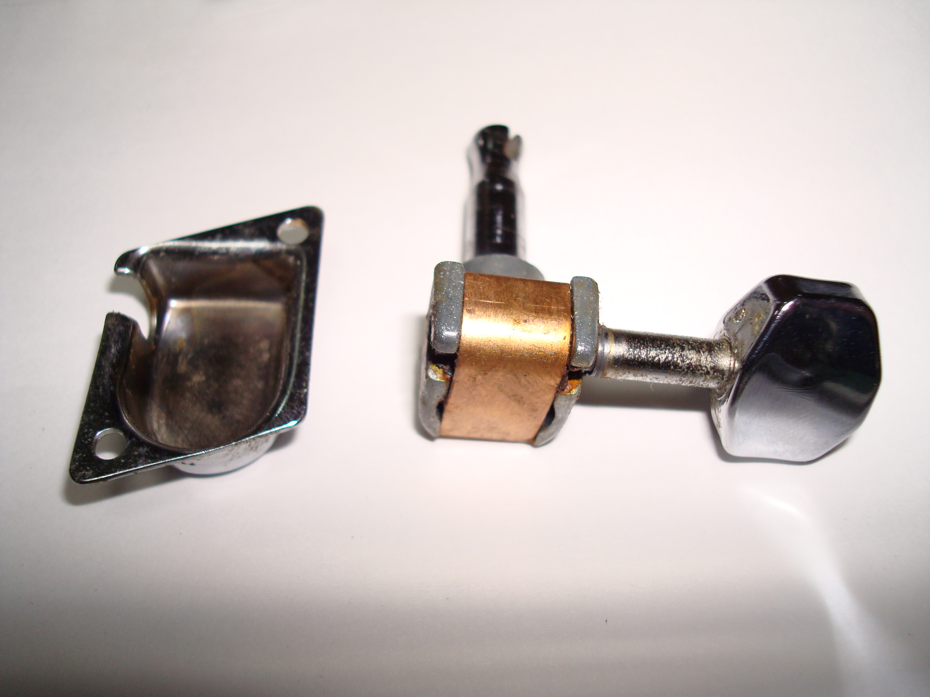 ギアは好みもあるだろう。1970年代にオリジナルF-Keyをロトマチックタイプに交換するのが流行った。これをすると、ヘッド側のシャフト穴を大きく加工する必要がある。シャーラーF-Keyの場合、最初からロトマチックと同じ大きい穴なので、ペグ交換の時のヘッド加工はいらない。